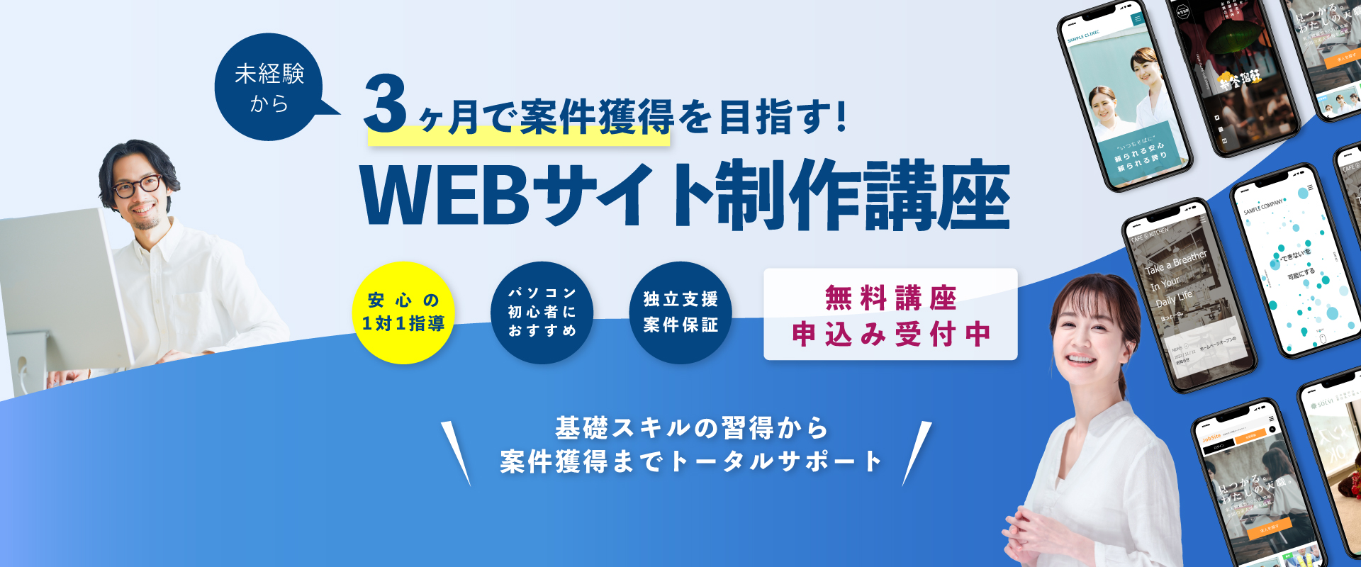 パソコン初心者でも安心してスタートできるWeb制作講座です。HTML、CSSなど実践的なスキルを基礎から丁寧に指導。パソコンの使い方からスタートするので、安心して学べます。ステップバイステップでスキルを確実に身につけ、実際にサイトを作成できる力をつけていきます。